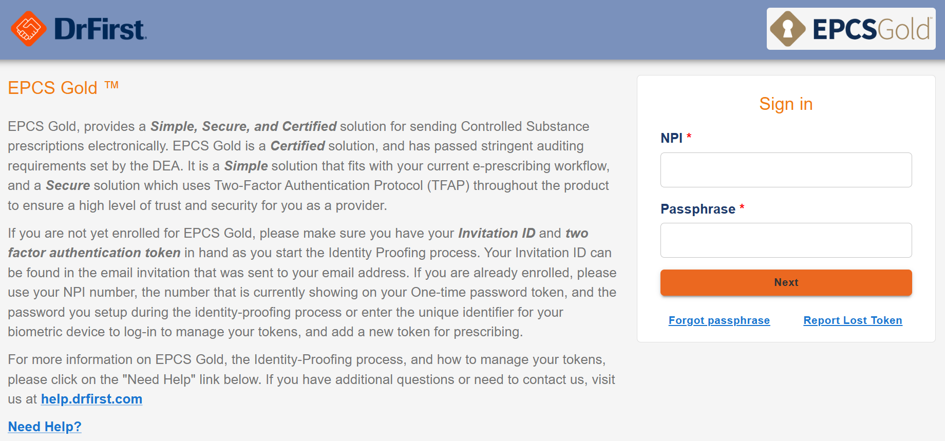 Onespan | Digipass GO7 | Submit a request to DrFirst | None; received in the mail |