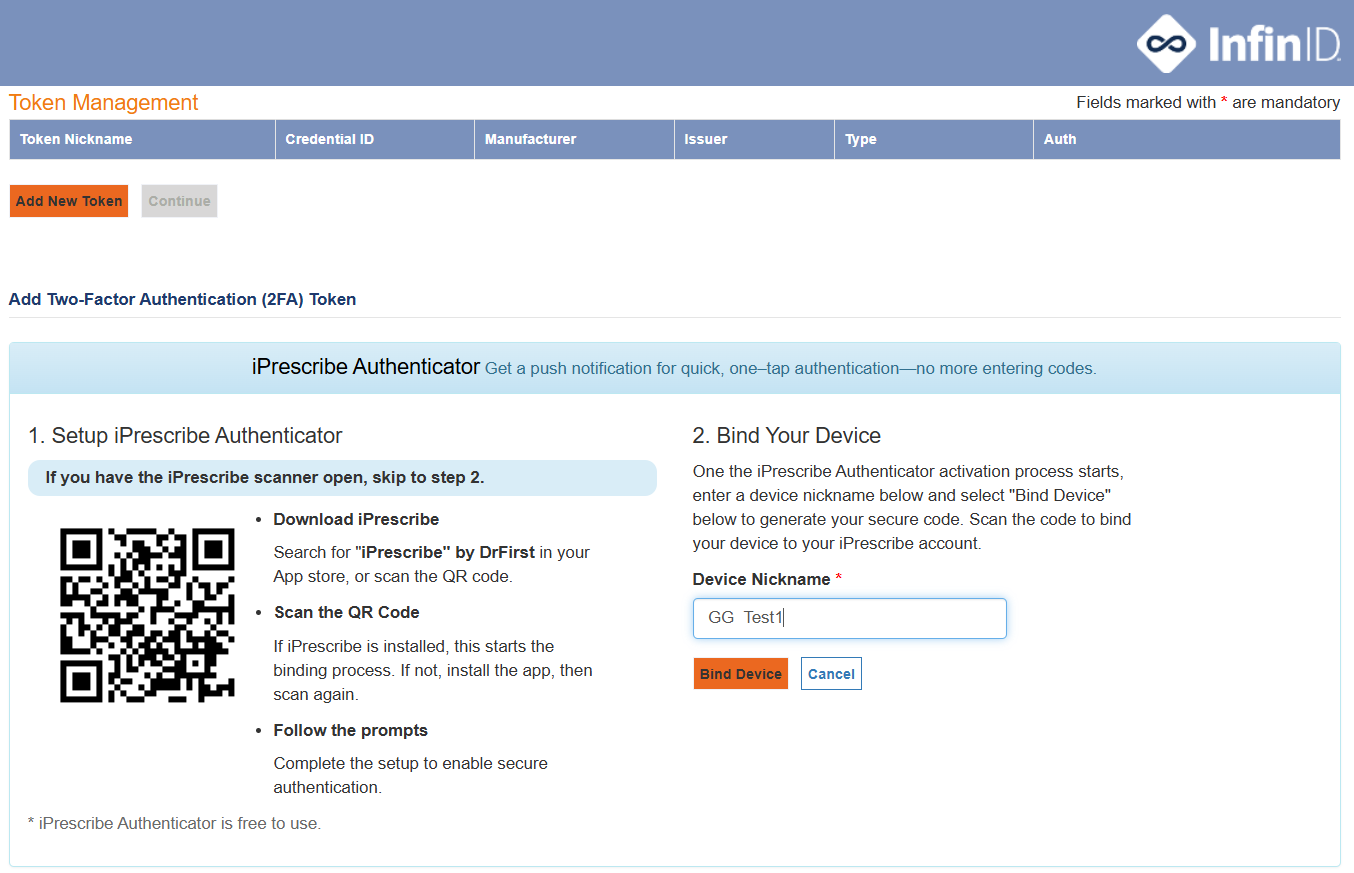Create a 'nickname' of your choice for the token, so you can identity it in the future (e.g. "iPhone SYMC app"). You will see this nickname each time you e-prescribe controlled substances. Do not use an underscore ("_") in your nickname. |