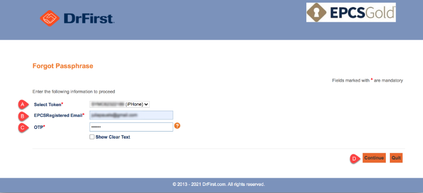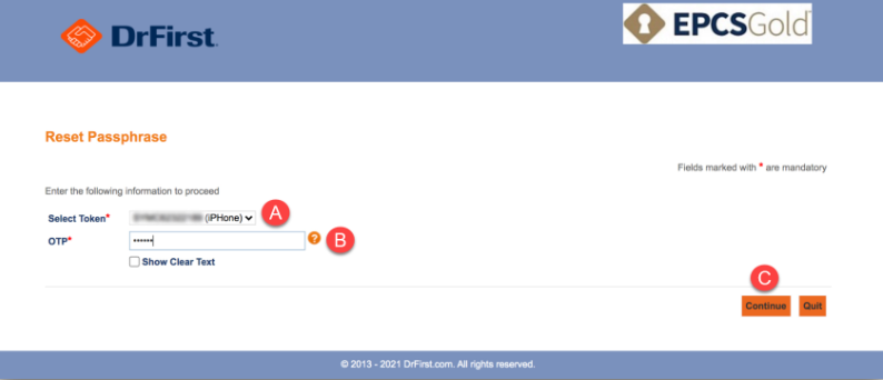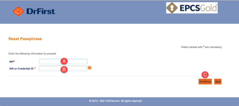 Note: Security answers are case sensitive. If you don't remember the Security Answer to your security question, please submit a request. We will send you a new EPCS registration link, where you will need to complete registration again and create a new passphrase.