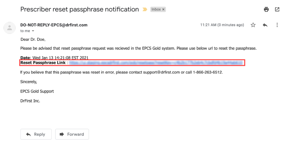 8. You will receive an email to reset your password. The subject of the email is Prescriber reset passphrase notification. Click the Reset Passphrase Link provided in that email.