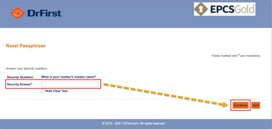 11. You will be prompted to answer the Security Question that you initially set up during the EPCS registration process. Enter the Security Answer, then click Continue.