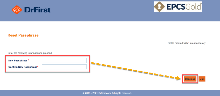 8. Enter a New Passphrase, then retype it next to the Confirm New Passphrase field. Click Continue when finished. Your new password must adhere to the following requirements: