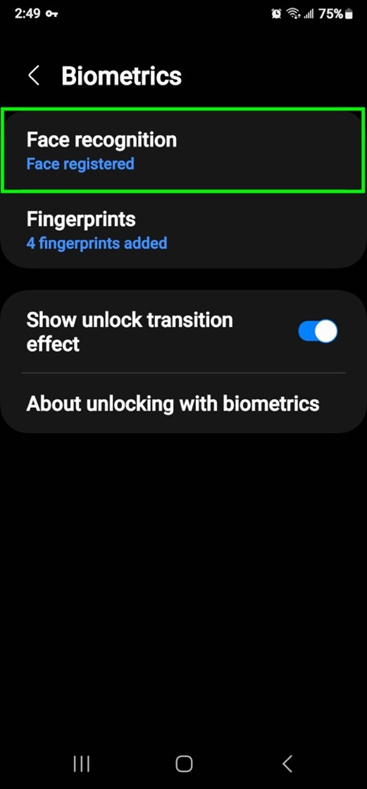 6. Once registered, choose how Face recognition will be used, such as unlocking your device or signing into apps.
