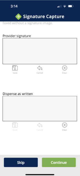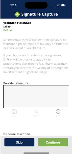 As depicted in the above image, DrFirst requires your handwritten signature to transmit e-prescriptions to fax-only pharmacies or in the event of an EDI failure. If you choose not to submit your signature, Drfirst will be unable to attach it to prescriptions that default to fax. Pharmacies may contact you to verify the validity of prescriptions faxed without a signature.