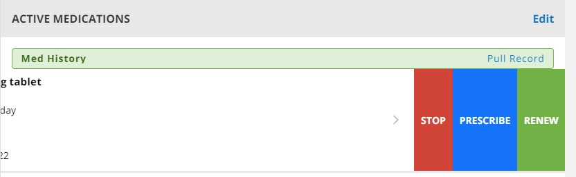 4. Either select the row of the medication you want to prescribe, or swipe left on the medication you want to prescribe to display the following options: Stop, Prescribe, or Renew.