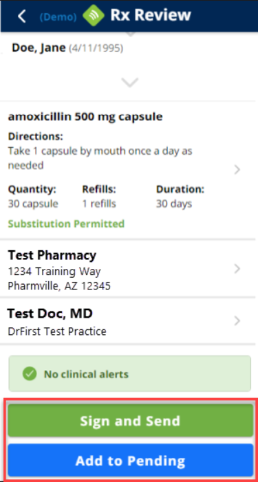 - Sign and Send to send this single prescription to the pharmacy immediately.