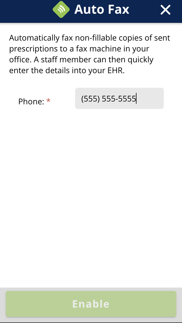 Auto Fax is an option that enables you to automatically fax non-fillable copies of sent prescriptions to a selected fax machine in your office. Staff members can then quickly enter the details into your EHR.