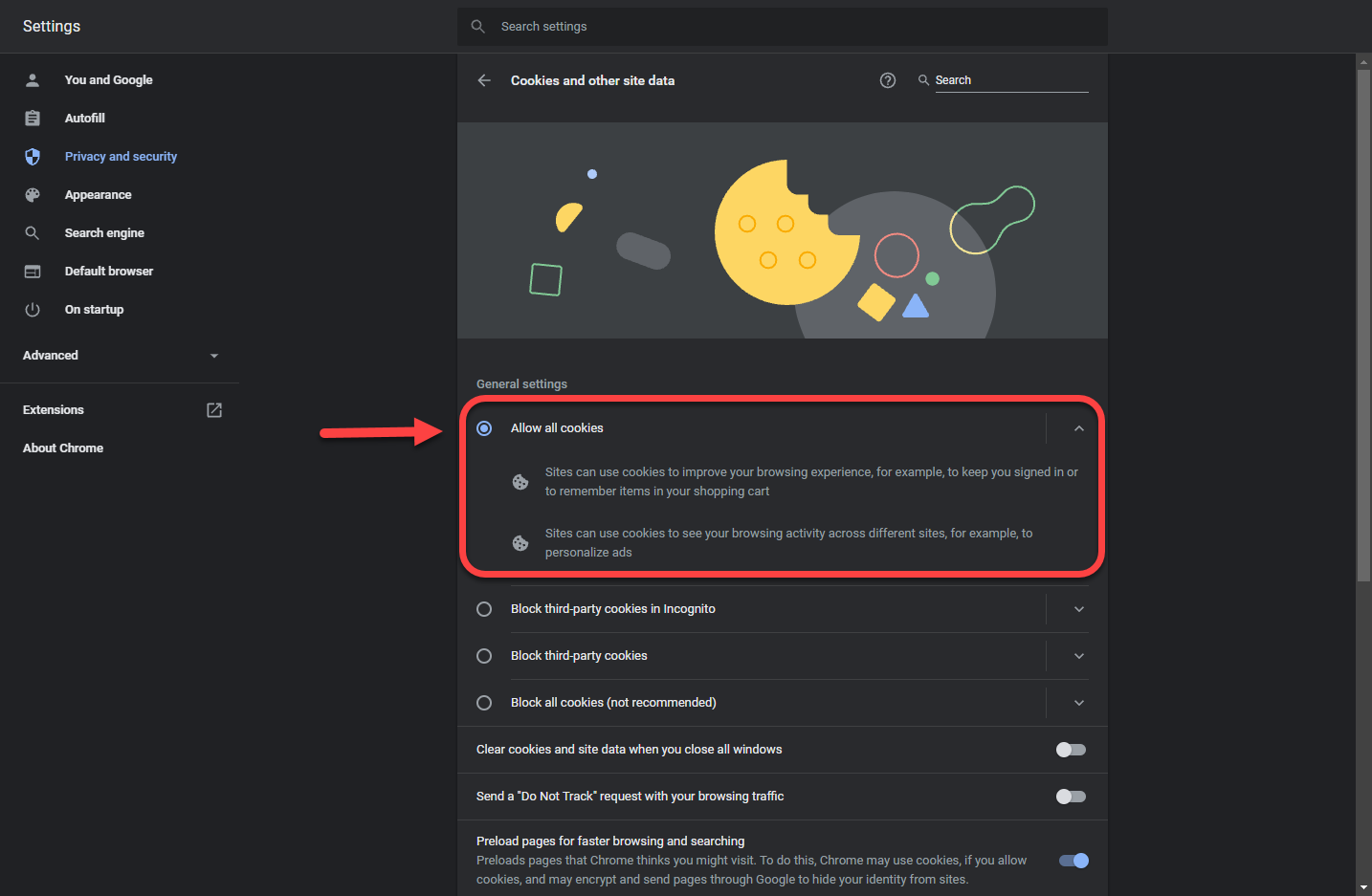 5. Select the option to Allow all cookies.