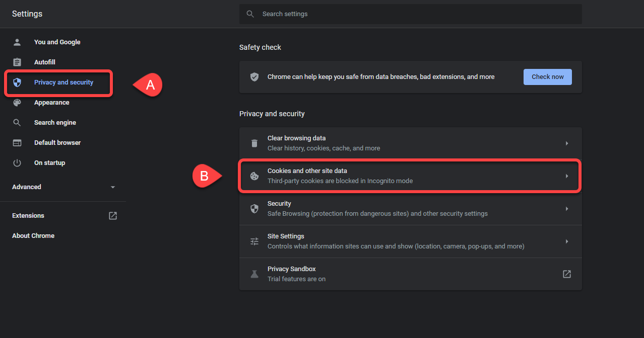 4. Click Cookies and other site data.