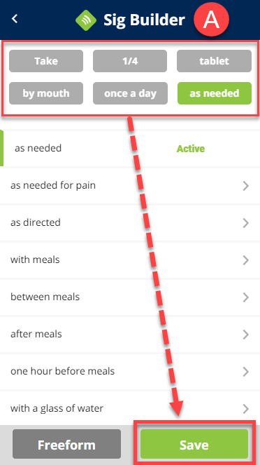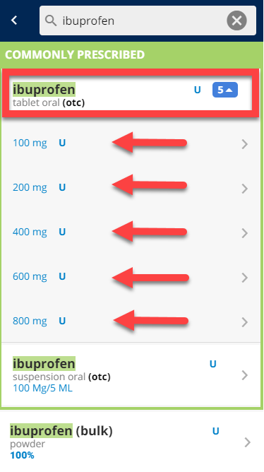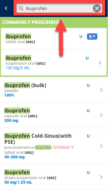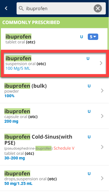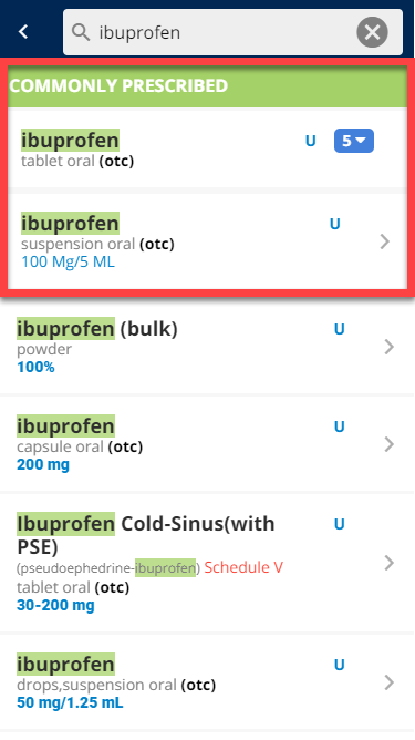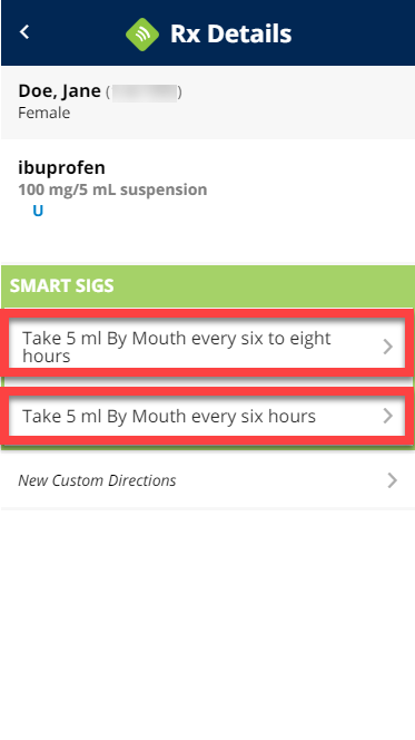 - If you would like to prescribe the medication with the details, dosage, and directions already pre-populated (via Smart Sigs), tap directly on the medication that already has the dosage information underneath.