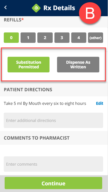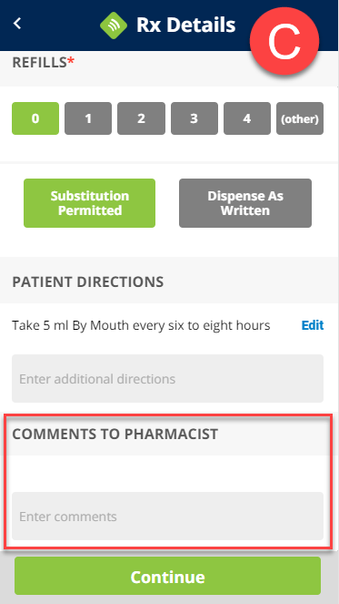 (C) Enter optional comments to the pharmacists, then tap Continue.