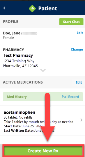 3. Tap the Create New Rx button at the bottom of the patient's profile screen.