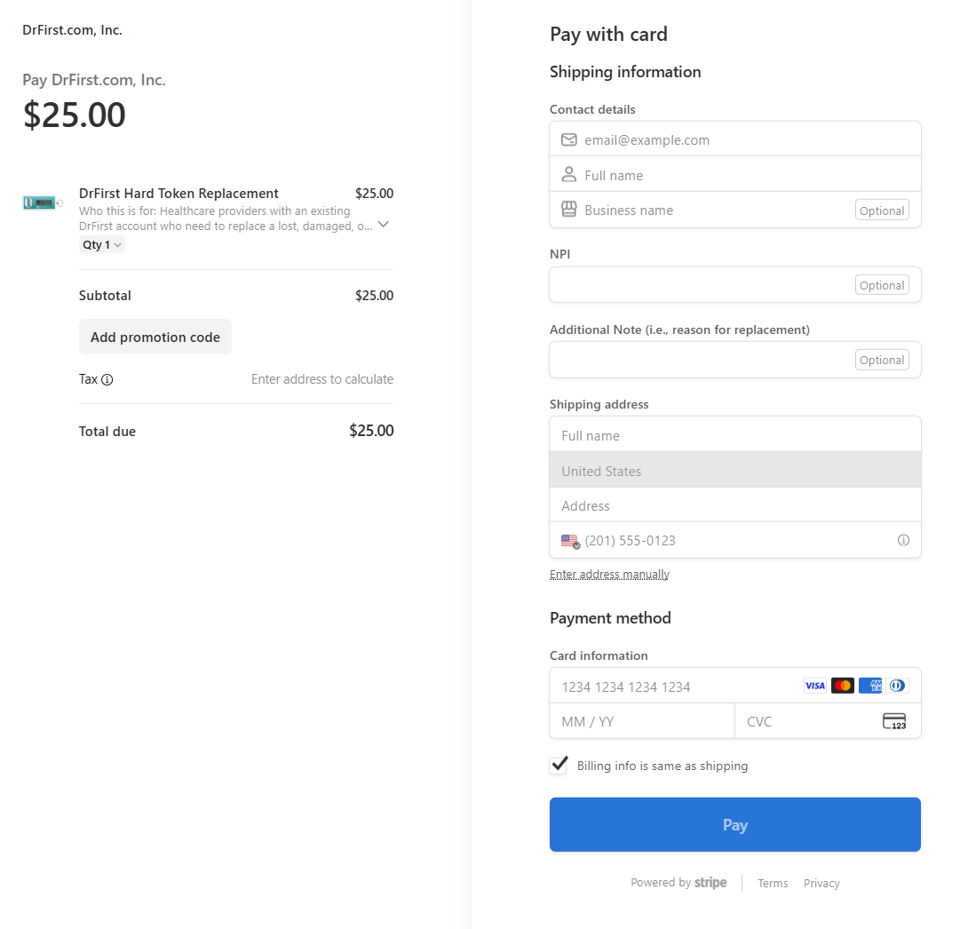- Contact your Customer Success Manager (CSM) or open a ticket with DrFirst Support to request a replacement token link. Access the link and select a quantity, then enter contact information. There is an order limit of 10 for replacement tokens.