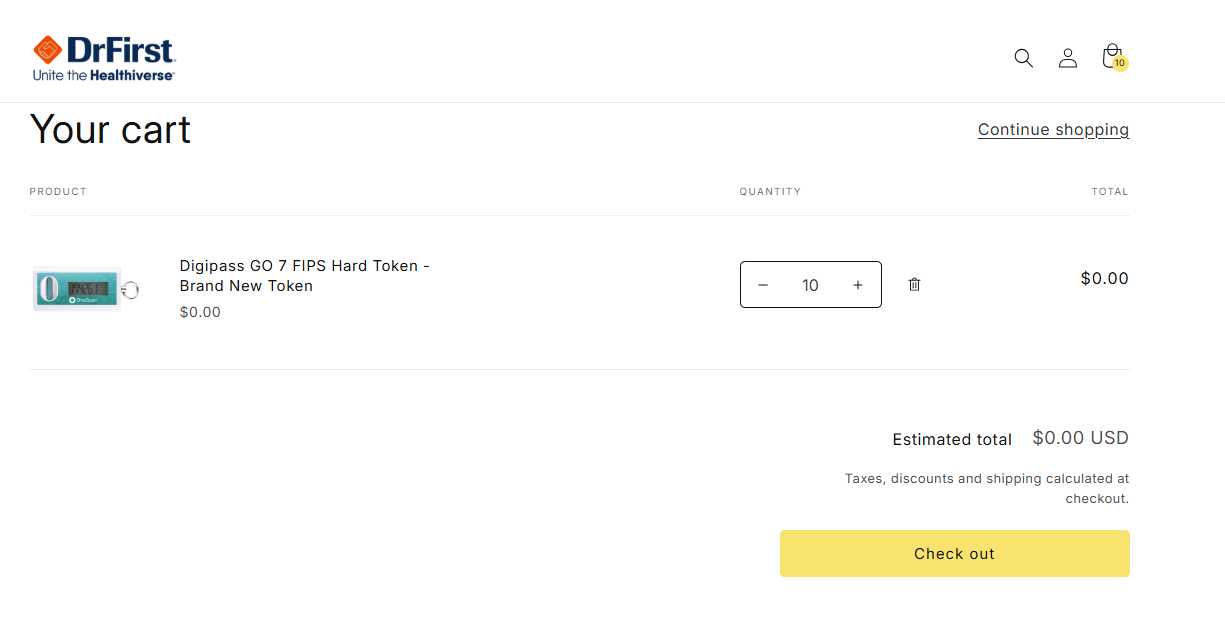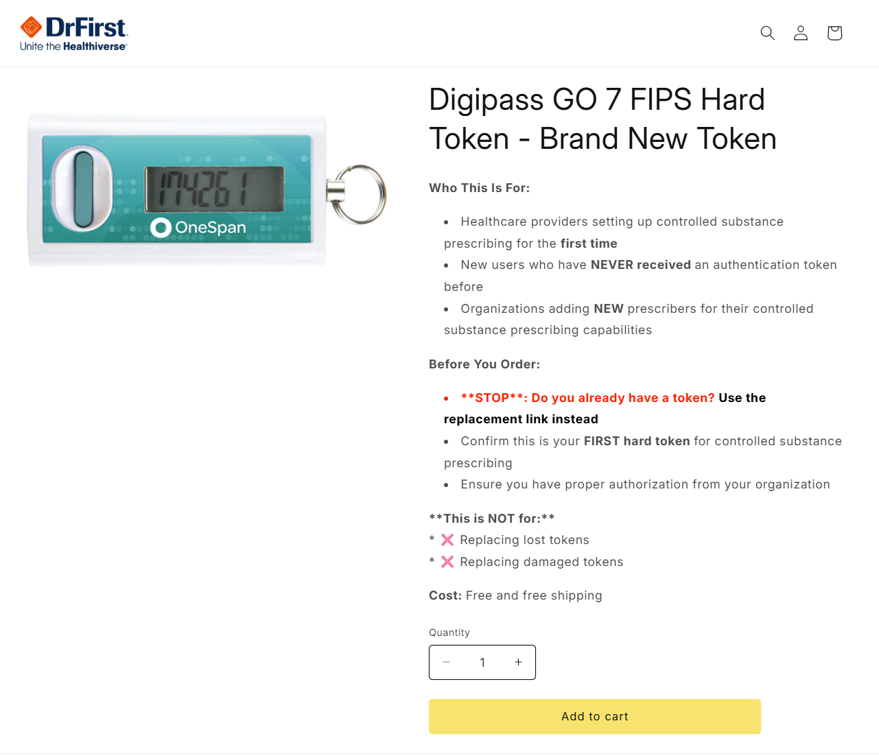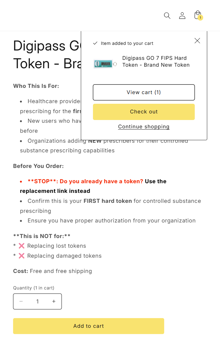 - Navigate to the DrFirst Hard Token Request storefront link to order a new hard token. Once on the storefront, select a quantity and click the Add to cart button.