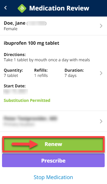 6. You will be redirected to the Medication Review screen for the selected prescription. Tap the Renew button at the bottom of the screen.