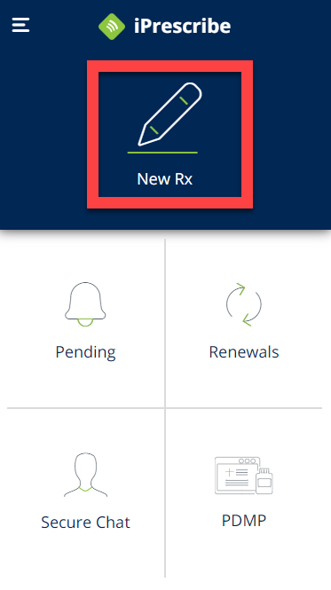 1. From the iPrescribe home screen, tap New Rx (pencil) icon.