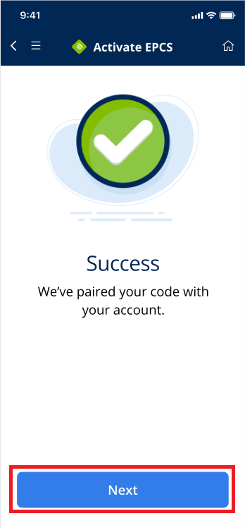 6. You will see a success message, indicating you are now authorized to begin electronically prescribing controlled substances (EPCS) using your two-factor authentication (login password and one-time pin from an authenticator).