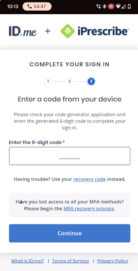 8. When prompted, open your ID.me Authenticator app and enter the code in the ID.me screen that you have open.