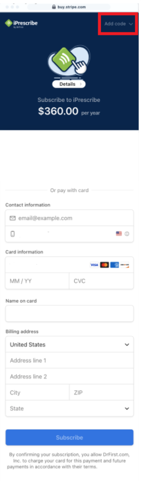 Enter your credit card information (1 credit card per practice). Note: You may still redeem a promotional code on this screen by selecting Add code at the top right.