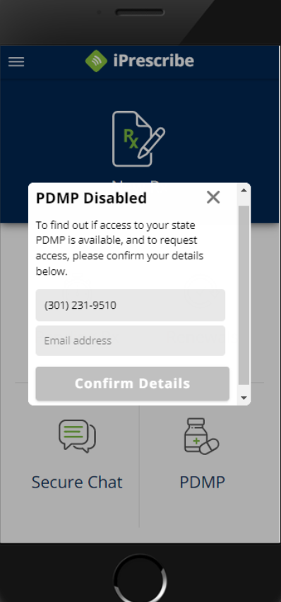 If PDMP is supported in your state, you can apply by tapping on the PDMP tile on the iPrescribe home screen. Enter your details in the pop-up form and submit to DrFirst.