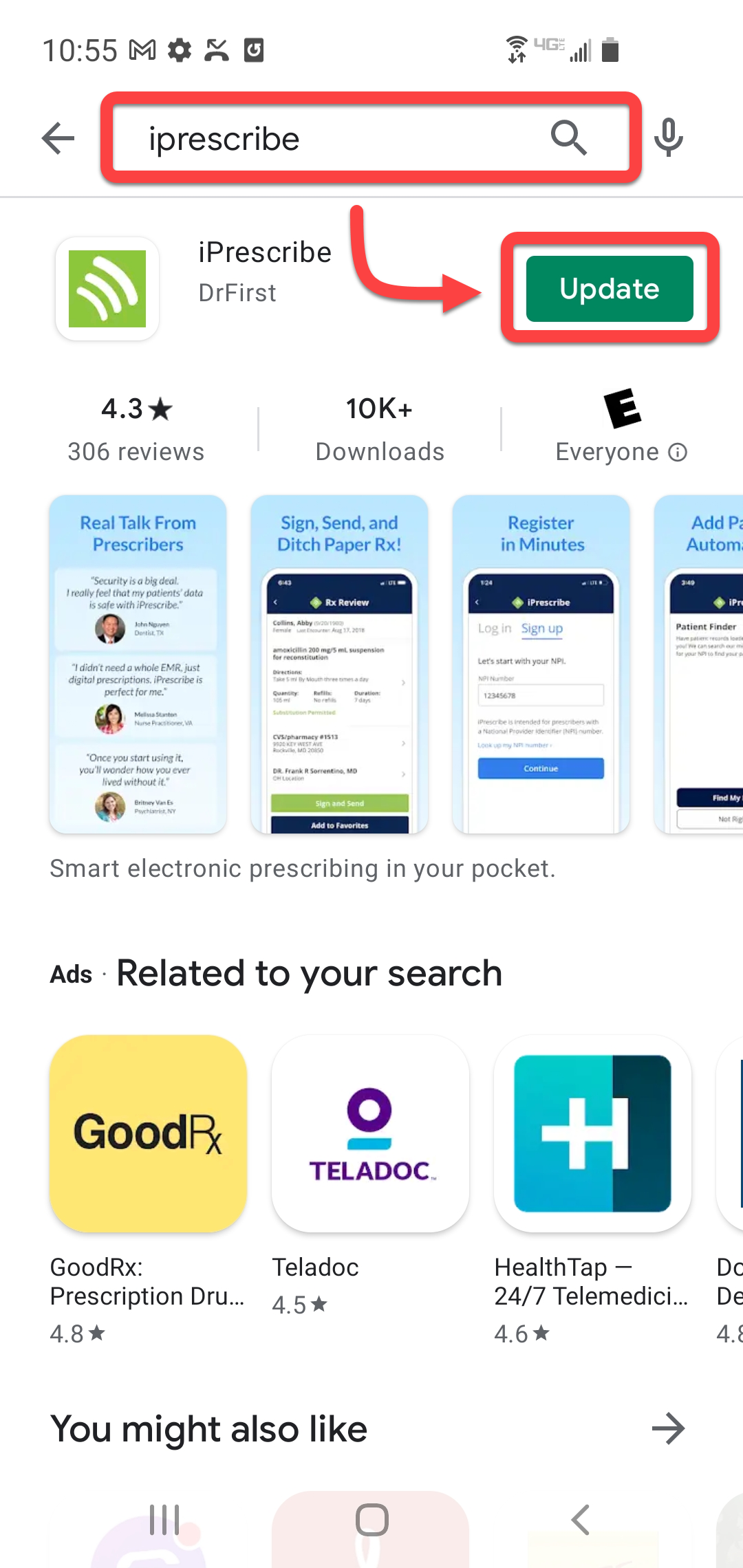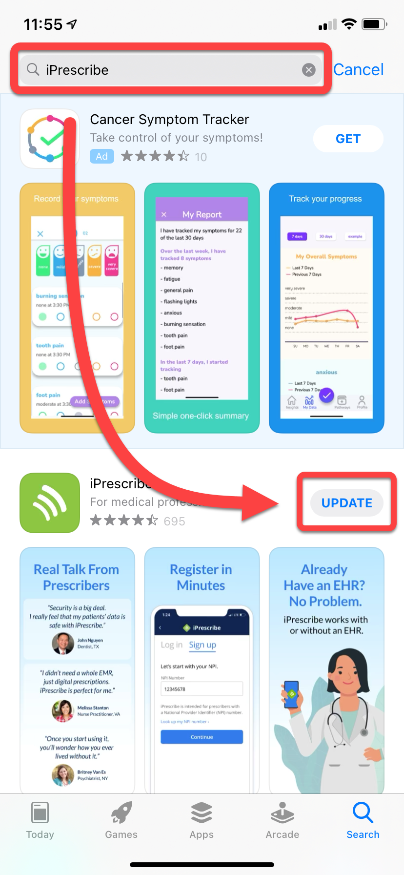 2. Search for iPrescribe in the search field at the top of your screen, then tap the Update button next to the iPrescribe app from your search results.