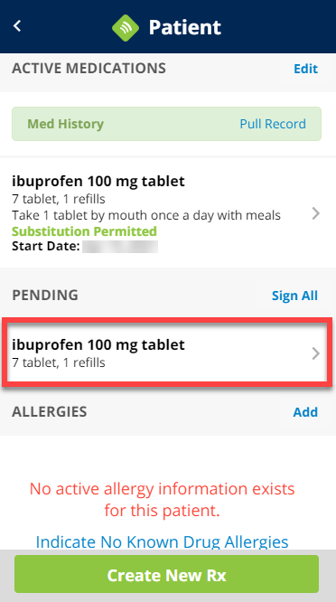 3. Under the section labeled Pending, tap the prescription you want to sign and send.