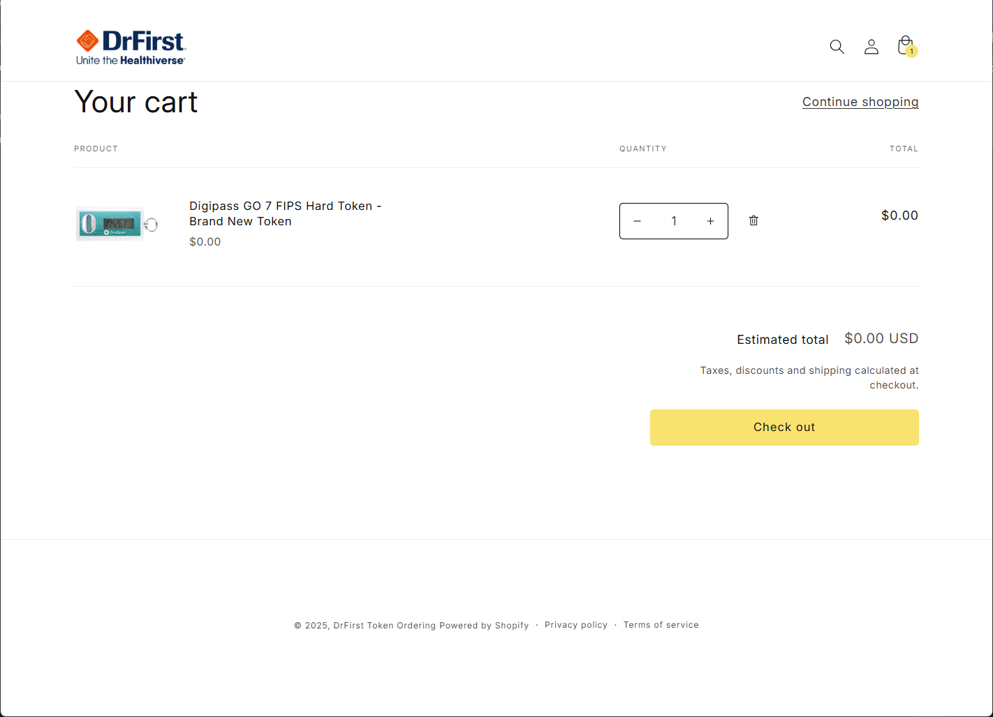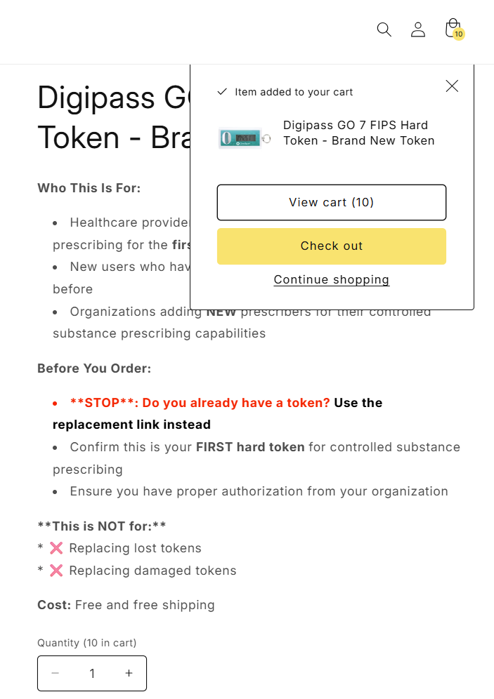 - Navigate to the DrFirst Hard Token Request storefront link to order a new hard token. Once on the storefront, select a quantity and click the Add to cart button.