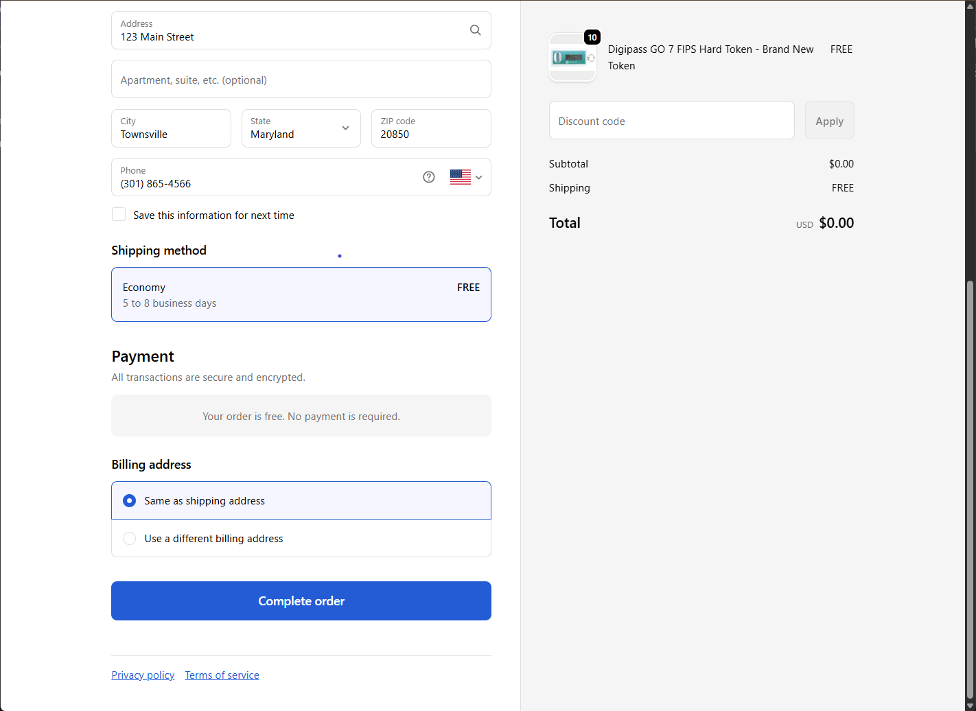 - Once all fields are complete and checked for accuracy, click Complete order to finalize your token order.