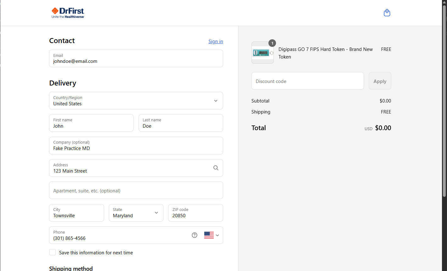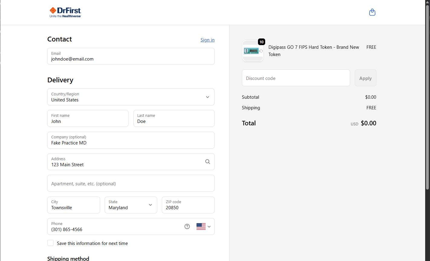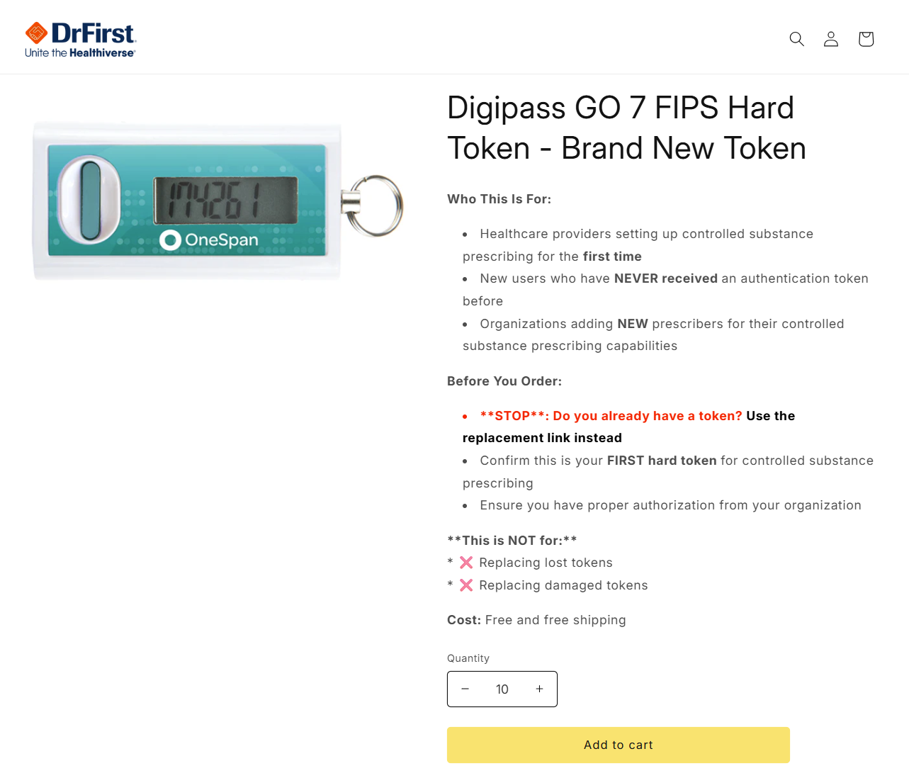 - Navigate to the DrFirst Hard Token Request storefront link to order a new hard token. Once on the storefront, select a quantity and click the Add to cart button.