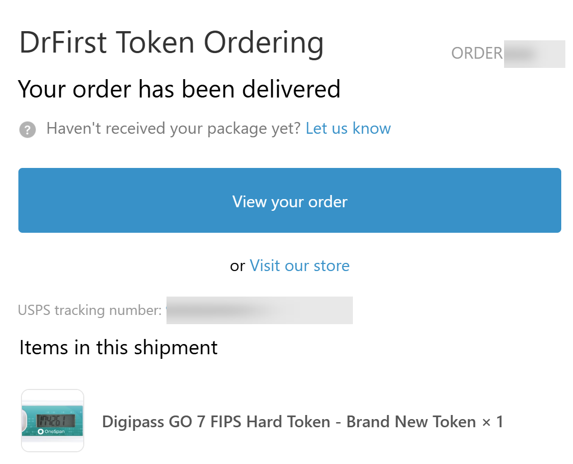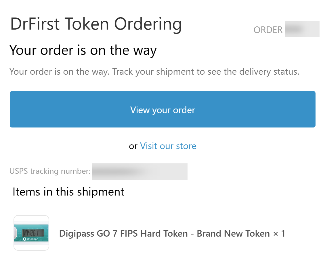 - Once your token order has shipped, you will receive another email containing a tracking number.